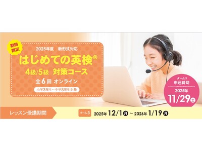英会話教室を運営する株式会社イーオン(本社:東京都新宿区、代表取締役社長:重野卓、以下「イーオン」)は、2026年1月25日(日)に行われる英検(R)に初めて挑戦するお子様に向けて、オンライン校のキッズクラスで「はじめての英検(R)4級・5級対策コース」を開講します。