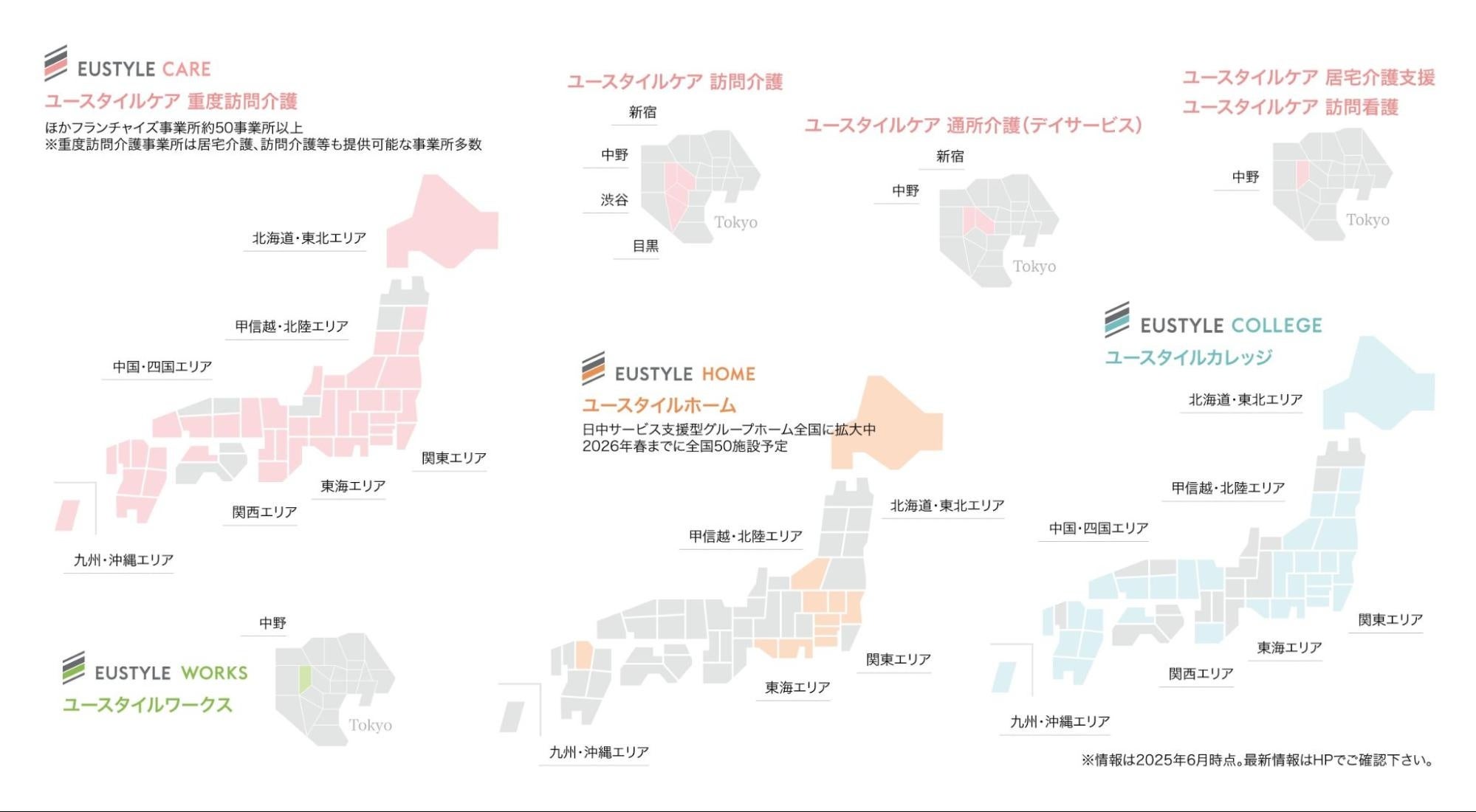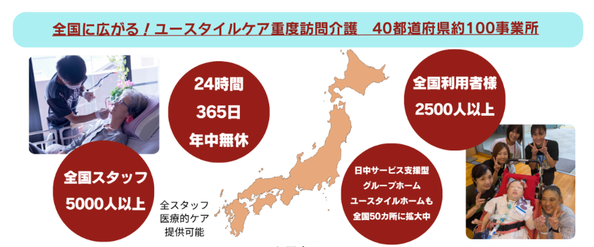 特に、障害福祉分野においては国内最大規模の障害者向け重度訪問介護事業者として、全国にサービスを広げています。 今後も全国各地に新規事業所・新規事業を展開し、日本の介護に関わるあらゆる課題解決に挑戦してまいります。