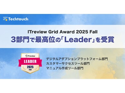 テックタッチ株式会社が提供・開発する、AI型デジタルアダプションプラットフォーム(DAP)国内シェア4年連続No.1の「テックタッチ」が、IT製品レビュープラットフォーム「ITreview」で発表された「ITreview Grid Award 2025 Fall」において、3部門で最高位である「Leader」を受賞したことをお知らせします。「デジタルアダプションプラットフォーム部門」と「マニュアル作成ツール部門」は、11期連続での受賞となります。