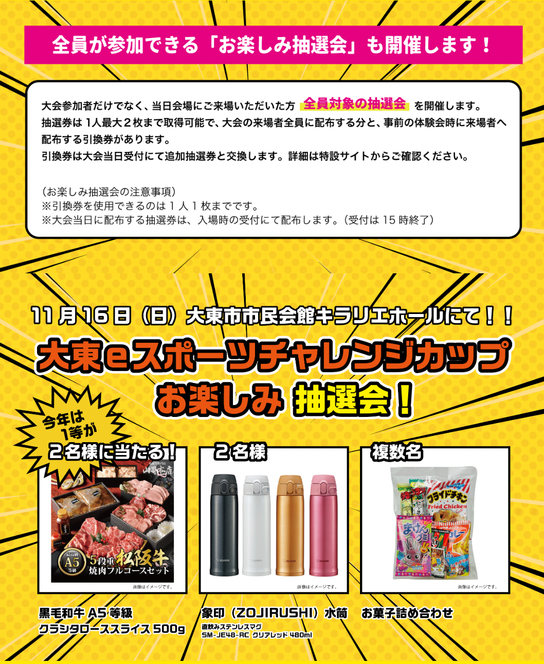 11月16日の「大東eスポーツチャレンジカップ」の最後には抽選会が開催されます。
