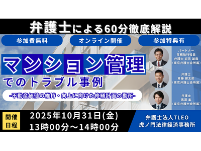 不動産価値の維持・向上に向けて大規模修繕や建て替えを検討する際の初動対応を誤ると、必要以上に費用が発生したり、住民間の対立が発生したりする事態を招きます。今回のセミナーでは最新のマンション管理のトラブル事例を基に大規模修繕や住民同士の合意形成、建て替え後の権利承継について解説します。マンション管理でのお悩みをお持ちの管理組合、マンションオーナーの方はぜひご参加ください。