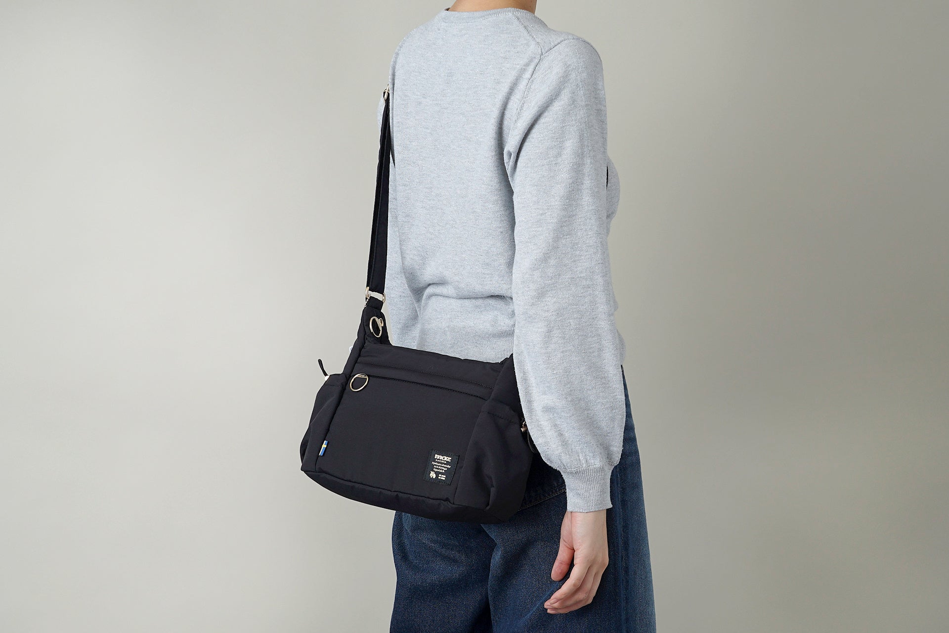 ショルダーストラップにも本体と同じボンディング生地を採用。肩にかけたときの馴染みも心地よい仕上がりです。
