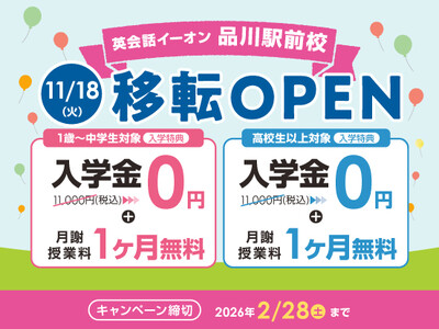 英会話教室を運営する株式会社イーオン(本社:東京都新宿区、代表取締役社長:重野卓、以下「イーオン」)は、2025年11月18日に「イーオン品川駅前校」をオープンいたします。