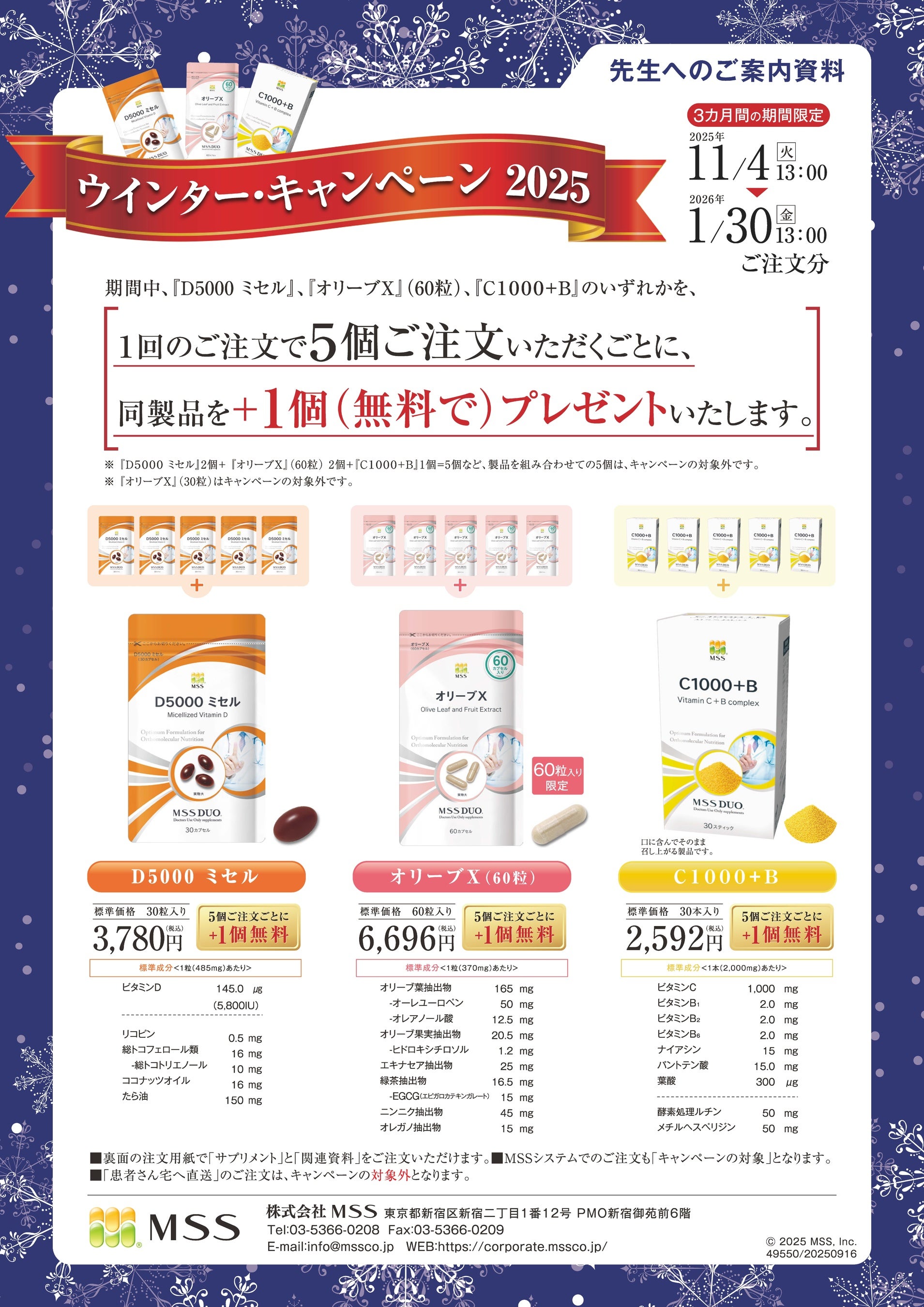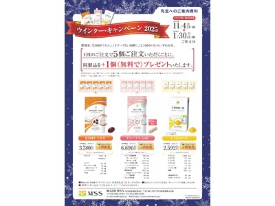医療機関専用サプリメントの開発・製造・卸販売のほか、医療機関におけるオーソモレキュラー栄養療法の導入・実践をトータルサポートする株式会社MSSでは、2025年11月4日(火)13:00~2026年1月30日(金)13:00まで、「ウインター・キャンペーン 2025」を開催いたします。