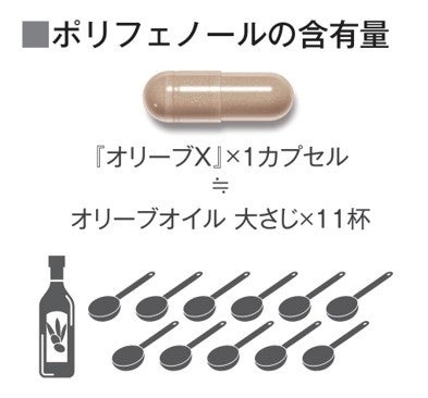 ポリフェノールが多く含まれるエキストラバージンオリーブオイルでも、その含有量は平均1kg(1,098ml)あたり 330 mg程度。MSSの『オリーブX』1カプセルに含まれるポリフェノールは、オーレユーロペンとヒドロキシチロソル合わせて51.2 mg。オリーブオイル170 ml、大さじで約11杯分にもなります。