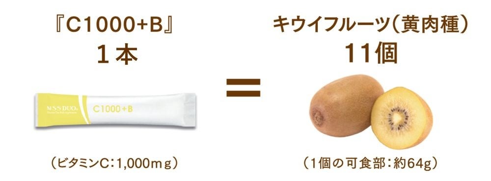 MSSの『C1000+B』は、キウイフルーツ(黄肉種)約11個分のビタミンC=「1,000mg」が1本に。さらに、ビタミンCと共にはたらくビタミンP群の「ルチン」と「ヘスペリジン」も配合されています。