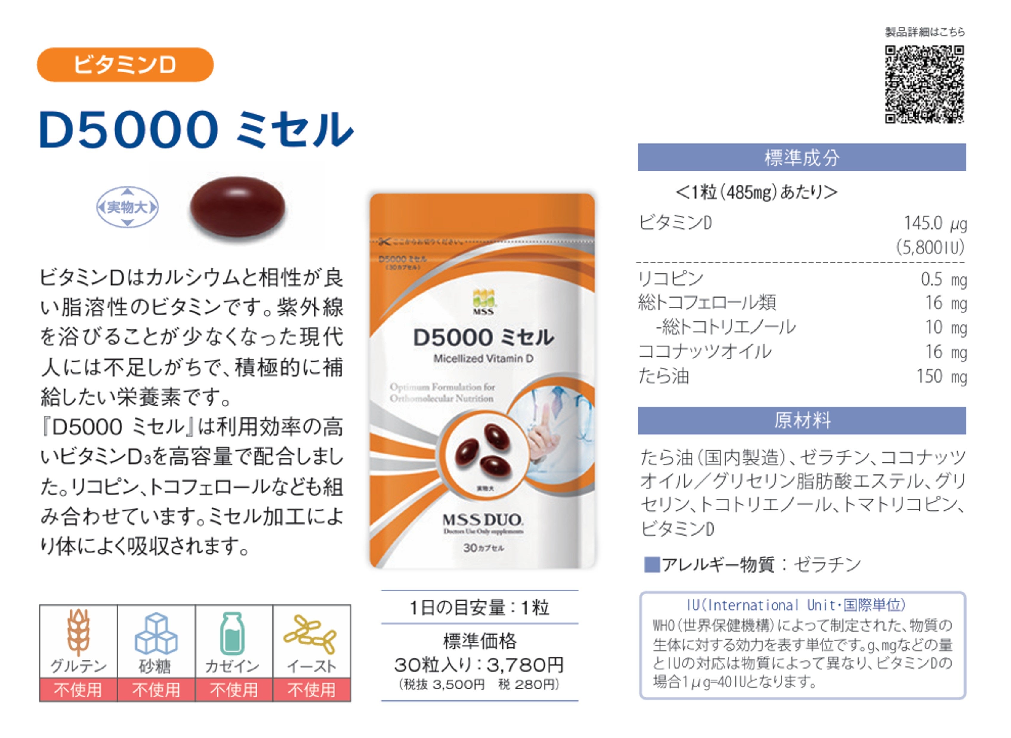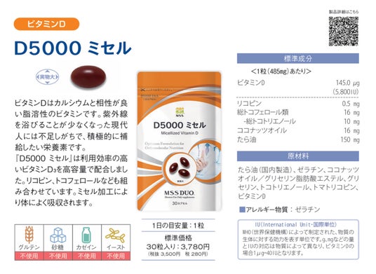 MSSの『D5000 ミセル』は、利用効率の高いビタミンD₃を高容量で配合。1粒で145.0µg(5,800IU)のビタミンDを摂取いただけます。