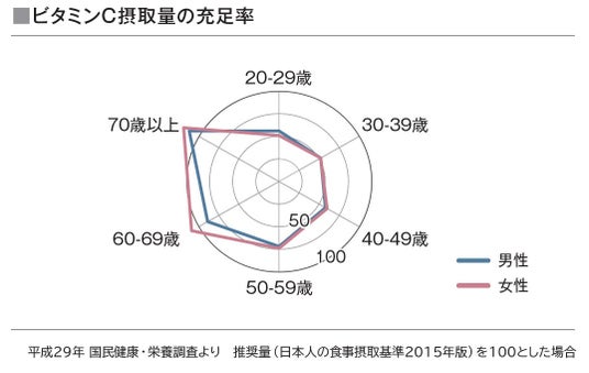 ビタミンCの摂取量は近年減少しており、男性では20~60代、女性では20~50代で摂取基準量を満たしていません。また、ビタミンCはストレスや紫外線、生活習慣などで損なわれやすく、加熱など調理の過程で減損していることを考えると、数値以上に不足しているということも考えられます。