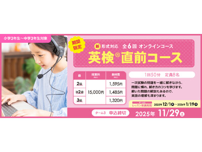 英会話教室を運営する株式会社イーオン(本社:東京都新宿区、代表取締役社長:重野卓、以下「イーオン」)は、2026年1月25日(日)に行われる英検(R)に向けて、オンライン校のキッズクラス及び高校生以上のクラスで「英検(R)対策直前コース」を開講します。本コースでは、一緒に一次試験の問題を解きながら問題に慣れ、解き方のコツを学びます。解いた問題の解説もあるので、英語の理解も深まります。