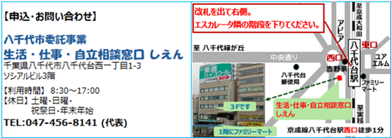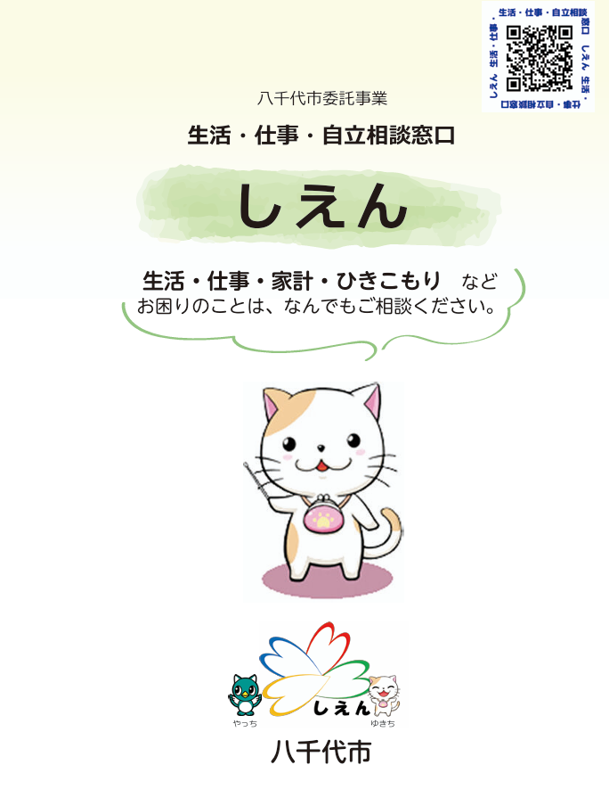 「生活・仕事・自立相談窓口 しえん(八千代市)」では、千葉県八千代市にお住まいで、生活に困窮されている方、お困りごとを抱えてらっしゃる方にむけたパンフレットを作成し、市内各所で配布しています。
