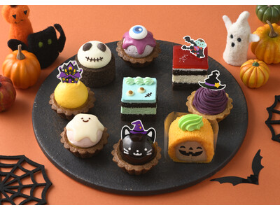特長:ハロウィンの仲間たちがホラーハウスに大集合!ちょっとこわくてかわいいおばけたちがパーティーを楽しむ様子を表現した、9種のバラエティ豊かなプチケーキです。「ホラーハウス」をイメージしたパンプキンクリームのタルトや、魔女をイメージした紫芋あんを絞ったタルトなど、季節の味を堪能しながらハロウィンもお楽しみください。