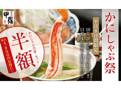 「おいしさと楽しさの創造」を理念に掲げる株式会社甲羅(本社:愛知県豊橋市、代表取締役社長:沼澤 裕)は、運営する老舗かに料理専門店「甲羅本店」)にて10月28日(火)~10月31日(金)、11月4日(火)~11月7日(金)の計8日間限定で対象のかにしゃぶメニューが半額になる「かにしゃぶ祭」を開催します。