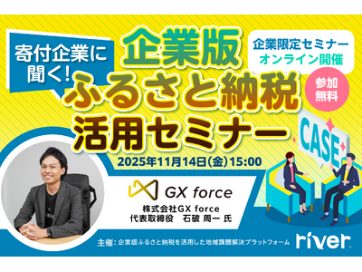 企業版ふるさと納税を活用した地域課題解決プラットフォーム「river(リバー)」を運営する株式会社カルティブ(本社:神奈川県横浜市、代表取締役:池田 清)は、2025年11月14日(金)に企業担当者限定で「寄付企業に聞く!企業版ふるさと納税活用セミナー」を開催いたします。