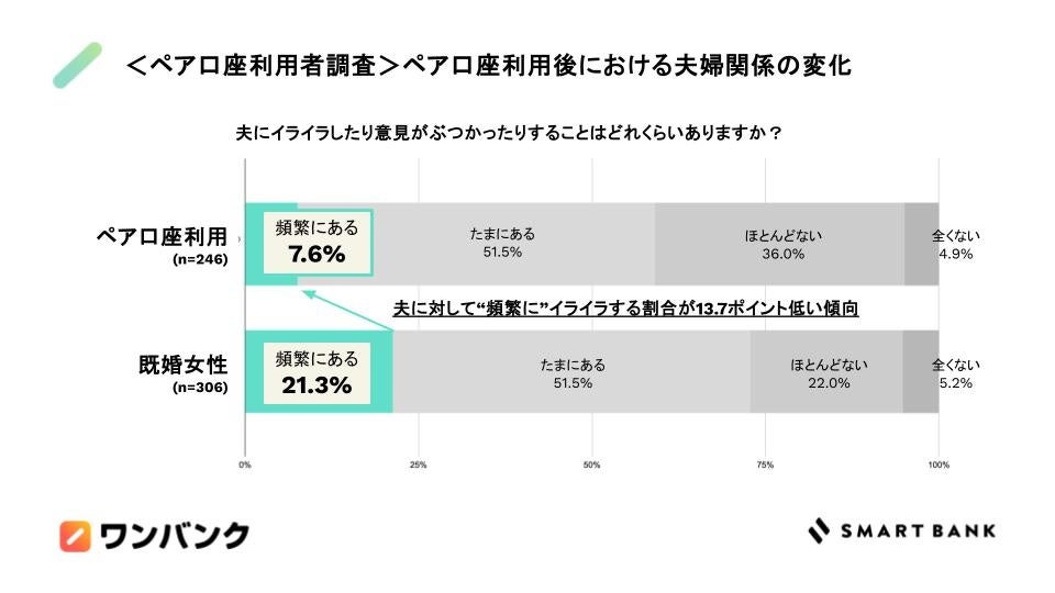 夫に“頻繁に”イライラする割合は、“ペア口座”を利用している妻が13.7ポイント低い傾向にあることがわかりました。
