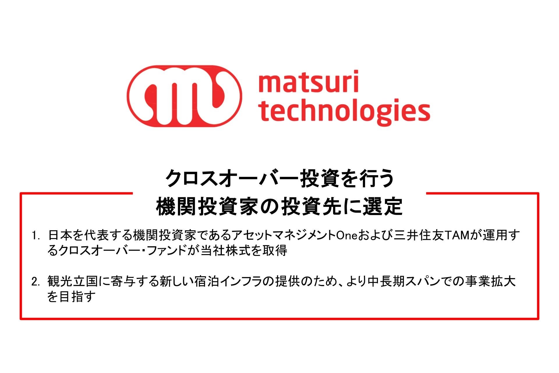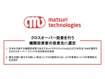 ソフトウェアを主軸に、空間の価値を最大化するソリューション「StayX」を運営するmatsuri technologies株式会社(本社:東京都新宿区)は、アセットマネジメントOne株式会社(本社:東京都千代田区、以下「アセットマネジメントOne」)が運用するファンド、三井住友トラスト・アセットマネジメント株式会社(本社:東京都港区、以下「三井住友TAM」)が運用するファンドが、当社の株式を取得したことをお知らせいたします。また、既存投資家のVertex Ventures SEA Fund V Pte. Ltd.も、当社株式を追加取得したことをお知らせいたします。