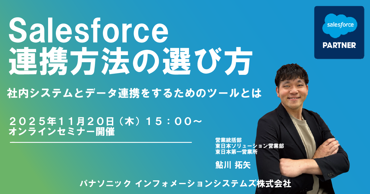 パナソニック インフォメーションシステムズ株式会社は、2025年11月20日(木)『Salesforce連携方法の選び方:社内システムとデータ連携をするためのツールとは』セミナーを開催します。