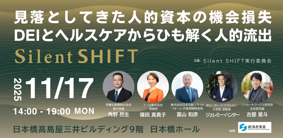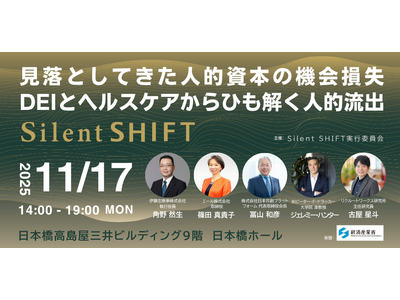 見落としてきた人的資本の機会損失 DEIとヘルスケアからひも解く人材流出 - Silent SHIFT」は、経済産業省の後援のもと、当社および陽と人が協力企業として参画する「Silent SHIFT 実行委員会」が主催します。株式会社Cradle、NTT PARAVITA株式会社、伊藤忠商事株式会社がパートナー企業として加わります。
