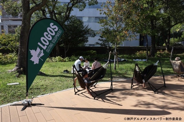 神戸グルメをイートスペースで食べるもよし、芝生にレジャーシートを広げて解放感あふれるピクニックもよし!公園を一望できる見晴らし広場には、アウトドアブランド「LOGOS」のハンモックやチェアなどアウトドアギアでくつろげるエリアも用意しています。また、当日は大道芸パフォーマンスも登場予定!