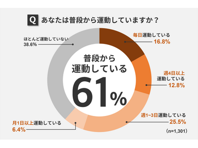 「普段から運動をしていますか?」の質問には、61%の人が月に1回以上の運動を行っていると回答しました。運動する頻度は、「毎日」(16.8%)、「週4日以上」(12.8%)、「週1~3日以上」(25.5%)、「月1日以上」(6.4%)と、週に1日以上運動をしているという人が半数を超える結果となりました。