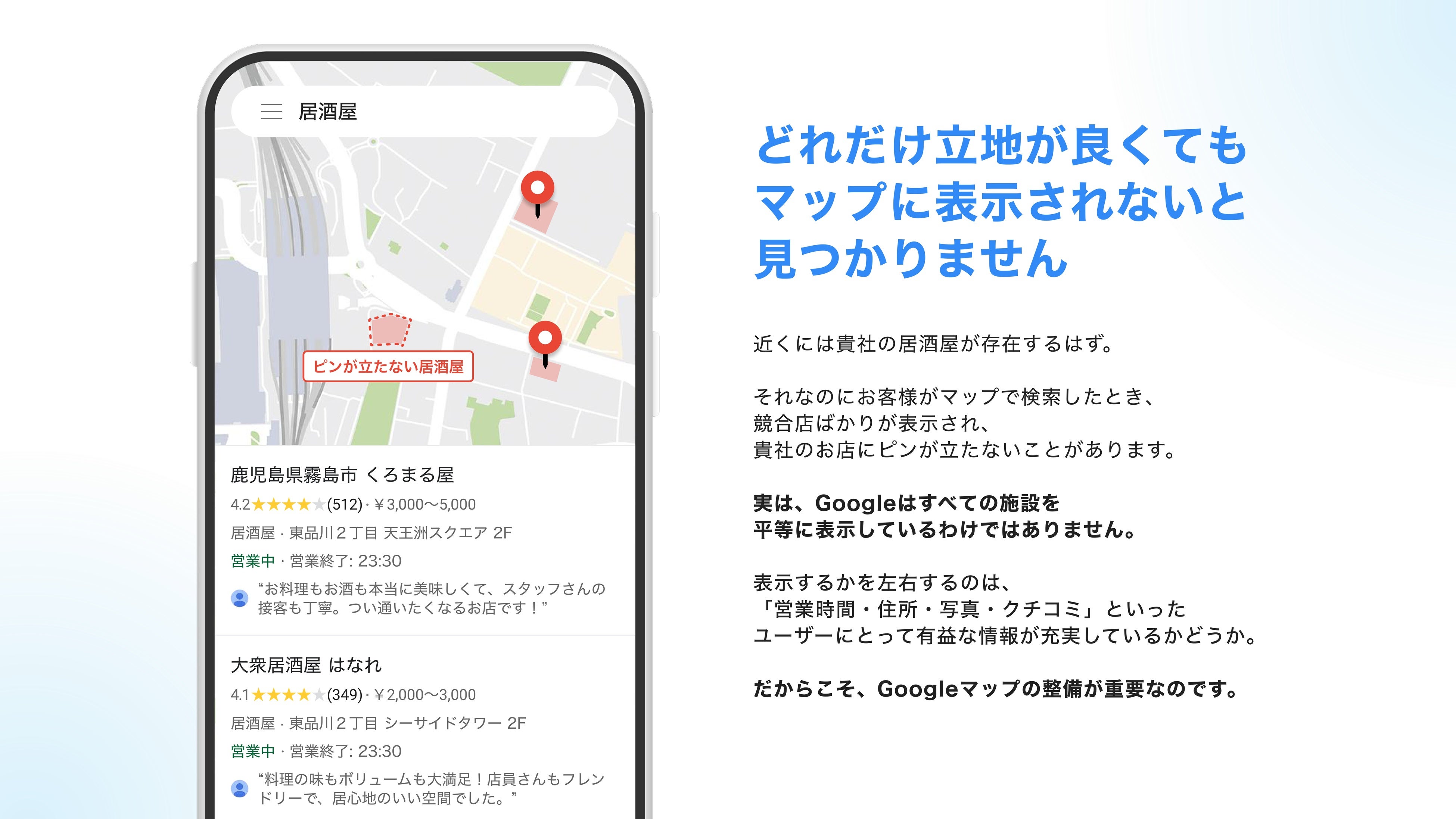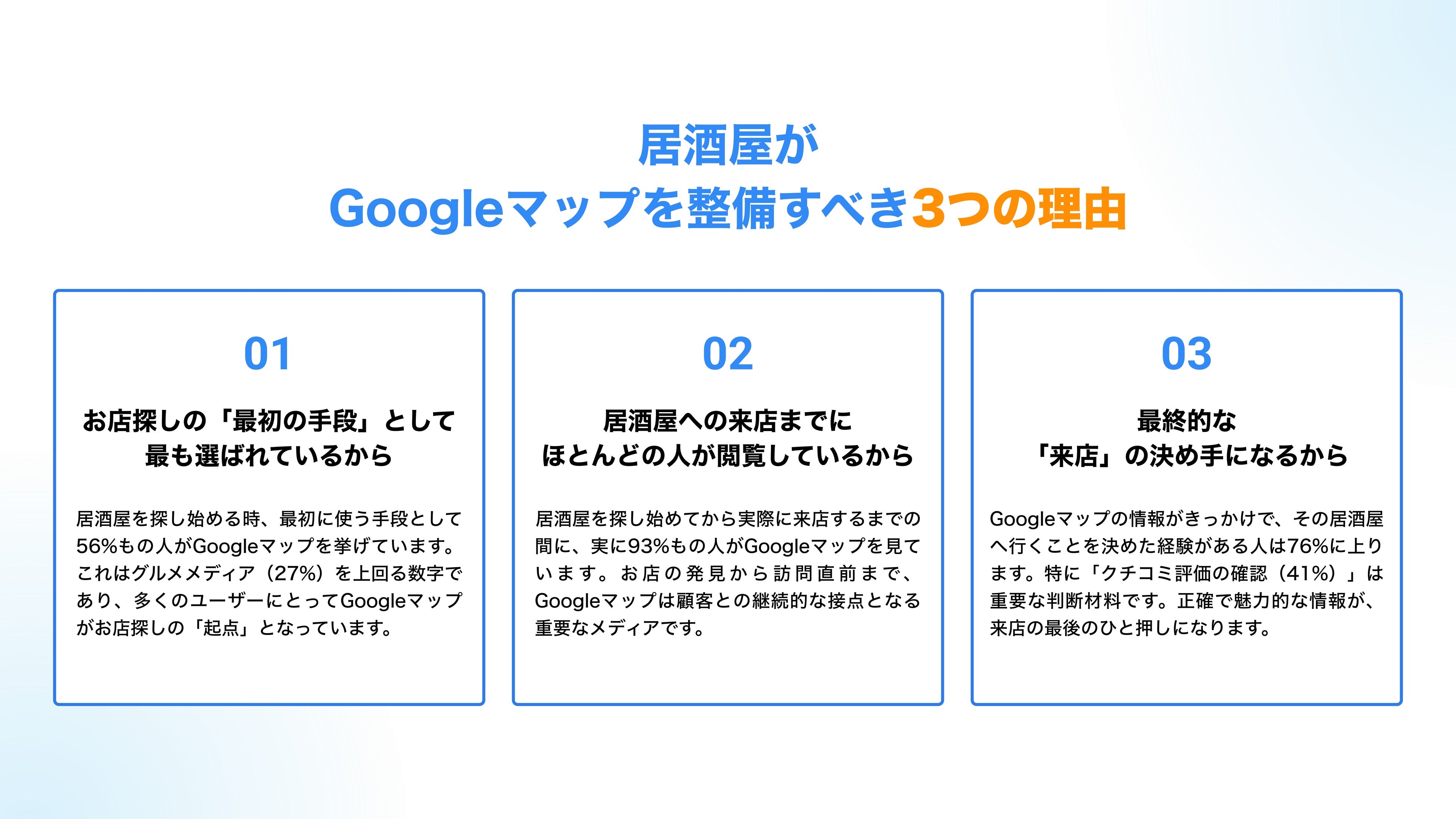 近年、Googleマップが居酒屋探しの”起点”となりつつあるため、いかにマップを整備するかが重要になっています。