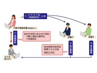 これにより、購買業務の柔軟性や負荷分散といった分散購買のメリットはそのままに、購入価格の標準化や低価格化といった集中購買のメリットも取り入れた運用が可能となります。
