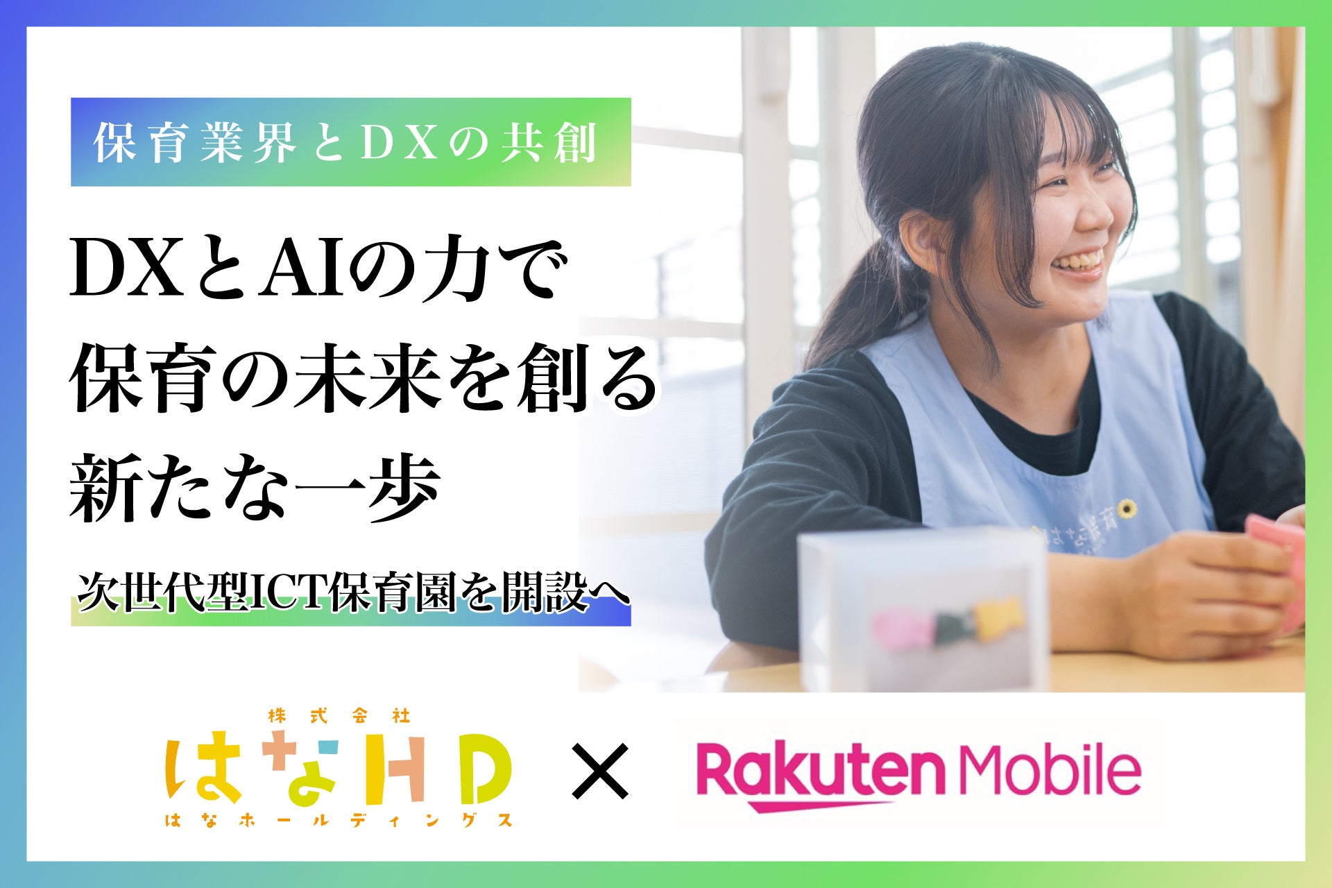 株式会社はなホールディングス(以下「はなホールディングス」)と、楽天モバイル株式会社(以下「楽天モバイル」)は、最先端のICT・AI技術を活用した「次世代型ICT保育園」の推進に向けた取り組みを開始することを発表します。