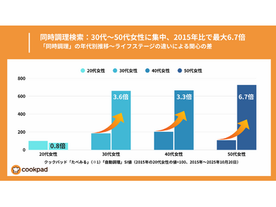 利用者数No.1レシピサービス「クックパッド」を運営するクックパッド株式会社は、「同時調理」レシピの検索動向を調査しました。調査の結果、共働き世帯を中心に、複数の料理を同時に作る「同時調理」が実践的なソリューションとして急速に広がっている実態が明らかになりました(※1)。