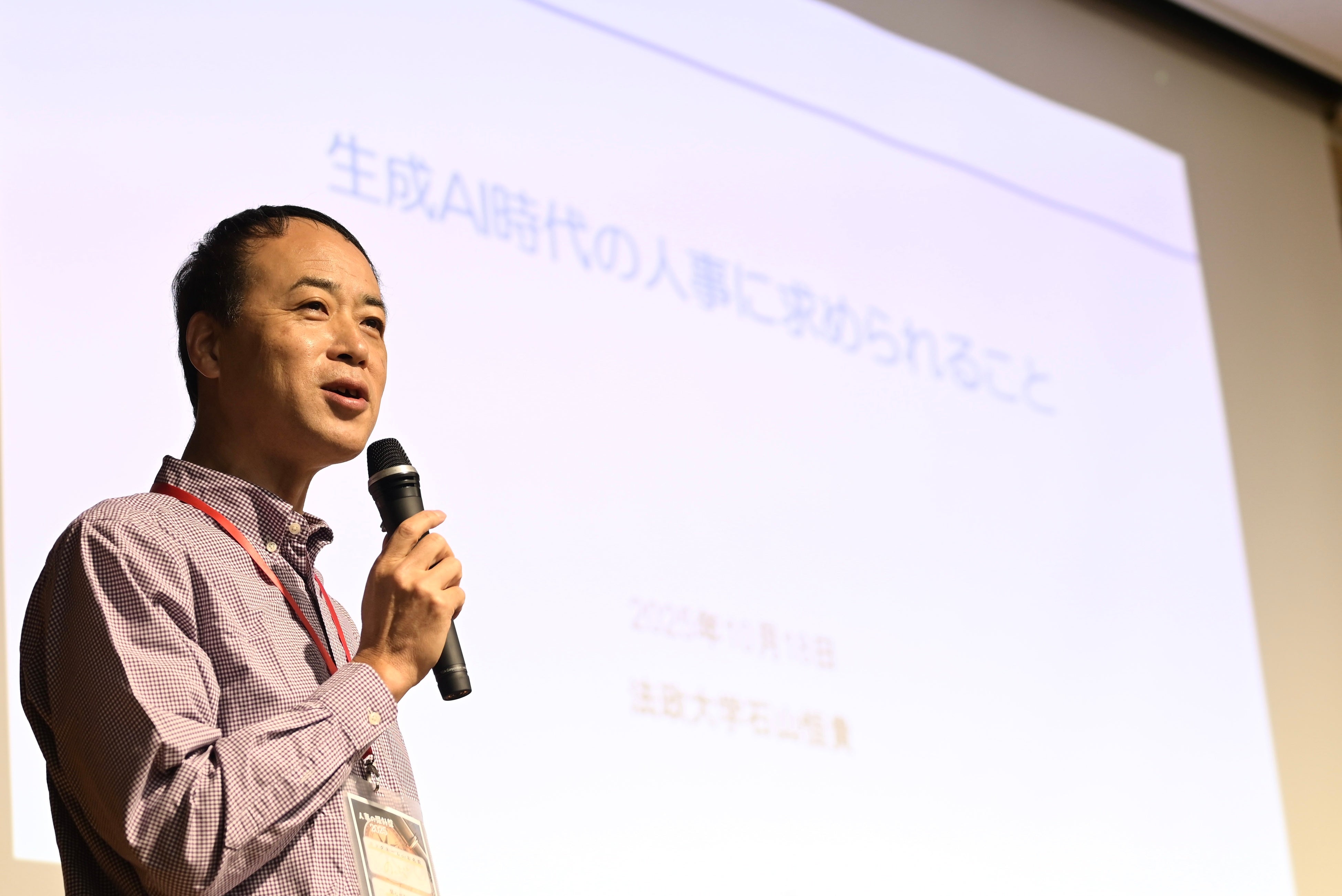 最初のセッションでは、生成AIの進化と人口減少が進む時代において、人事に求められる役割の変化についてお話いただきました。石山氏は、日本の労働市場には「無限定総合職、標準労働者、マッチョイズム」という3点セットに対する「暗黙の了解がある」と述べ、AIを労働代替ではなく創造性を高める補完的存在として捉える視点を提示しました。「これからの人事は、従業員のニーズを把握することに情熱を持ち、対話に卓越することが求められている」という言葉に、多くの参加者がうなずきました。