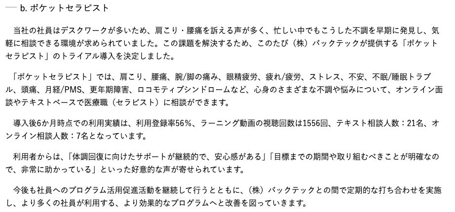 バックテックは、幅広い業界の健康経営をサポートし、より多くの企業・団体が「ポケットセラピスト」を活用することで、健康的で持続可能な社会の実現に貢献してまいります。