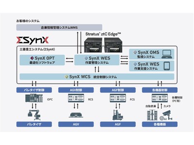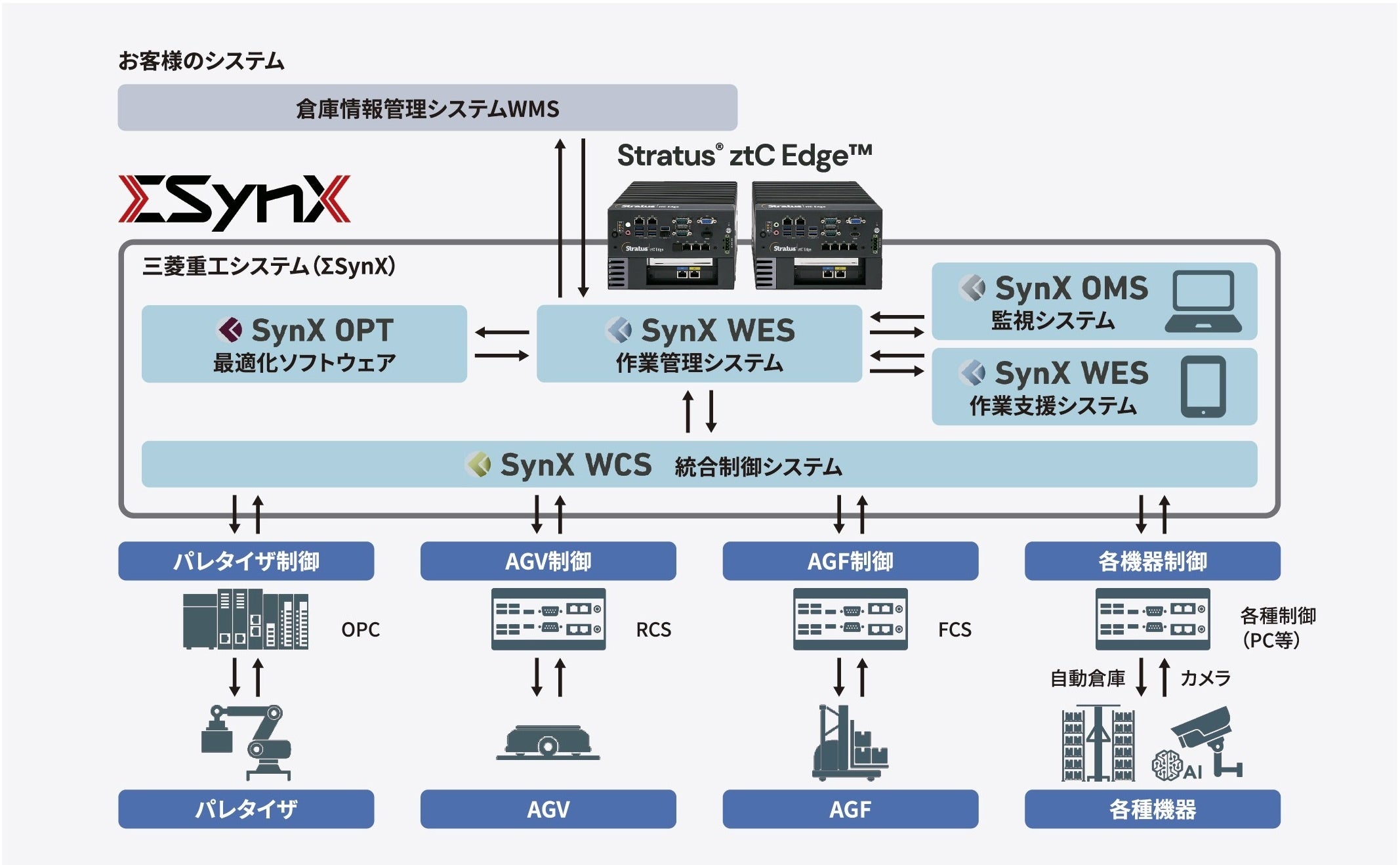 ・ 総合制御システム「SynX WCS」:作業計画に基づいた機器の制御と、状態監視と機器異常への対応また、この自動ピッキングソリューションは三菱重工の標準プラットフォーム「ΣSynX」上に構築されており、そのコントローラーとして「Stratus ztC Edge」が使用されています。