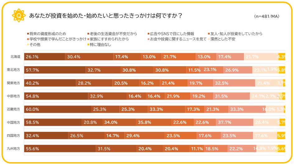 また、中国地方(35.8%)や近畿地方(33.3%)では、「友人・知人が投資をしていたから」といった周囲の影響による投資動機が他地域よりも高い傾向が見られ、身近な人の投資行動が後押しとなっていることがうかがえる。
