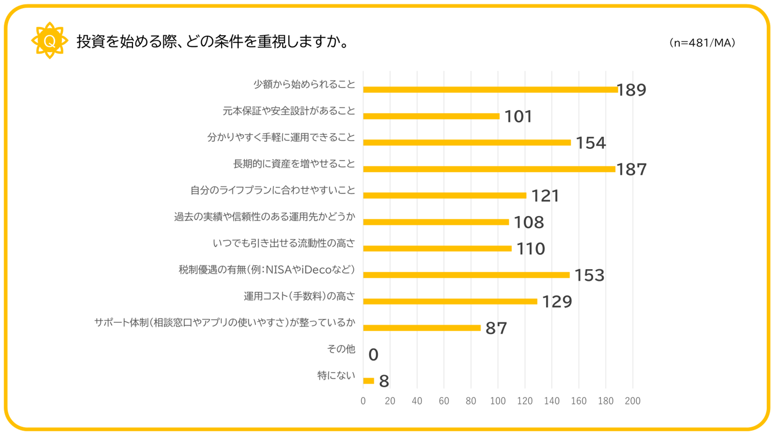 ・投資を始める際に重視する条件は、「少額から始められる」(189件、39.3%)「長期的に資産を増やせる」(187件、38.9%)「分かりやすく手軽に運用できる」(154件、32.0%)など、リスクの低さや利便性を重視する傾向が見られた。