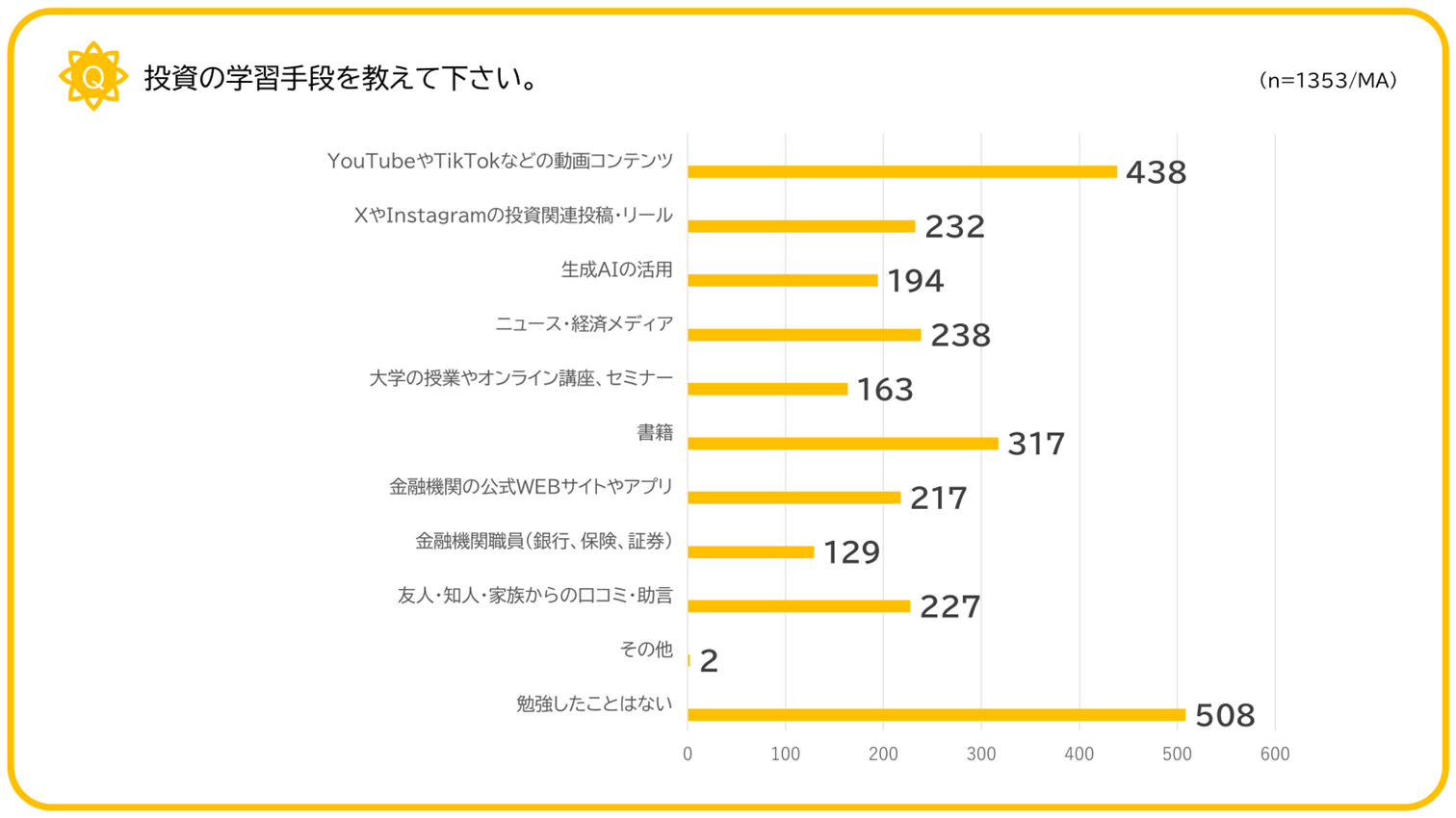 動画やSNSが投資の学習機会を増やしてくれていると感じられる、明るい結果だと思いました。投資に関する情報に触れる機会が増えているためか、