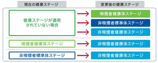 加入時に「健康ステージ」を適用できなかった場合でも、ご契約後の所定の期間内に当社の定める健康状態(過去1年間以上喫煙歴がないなど)を満たした場合には、新たに健康ステージの適用もしくは変更ができます。