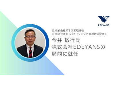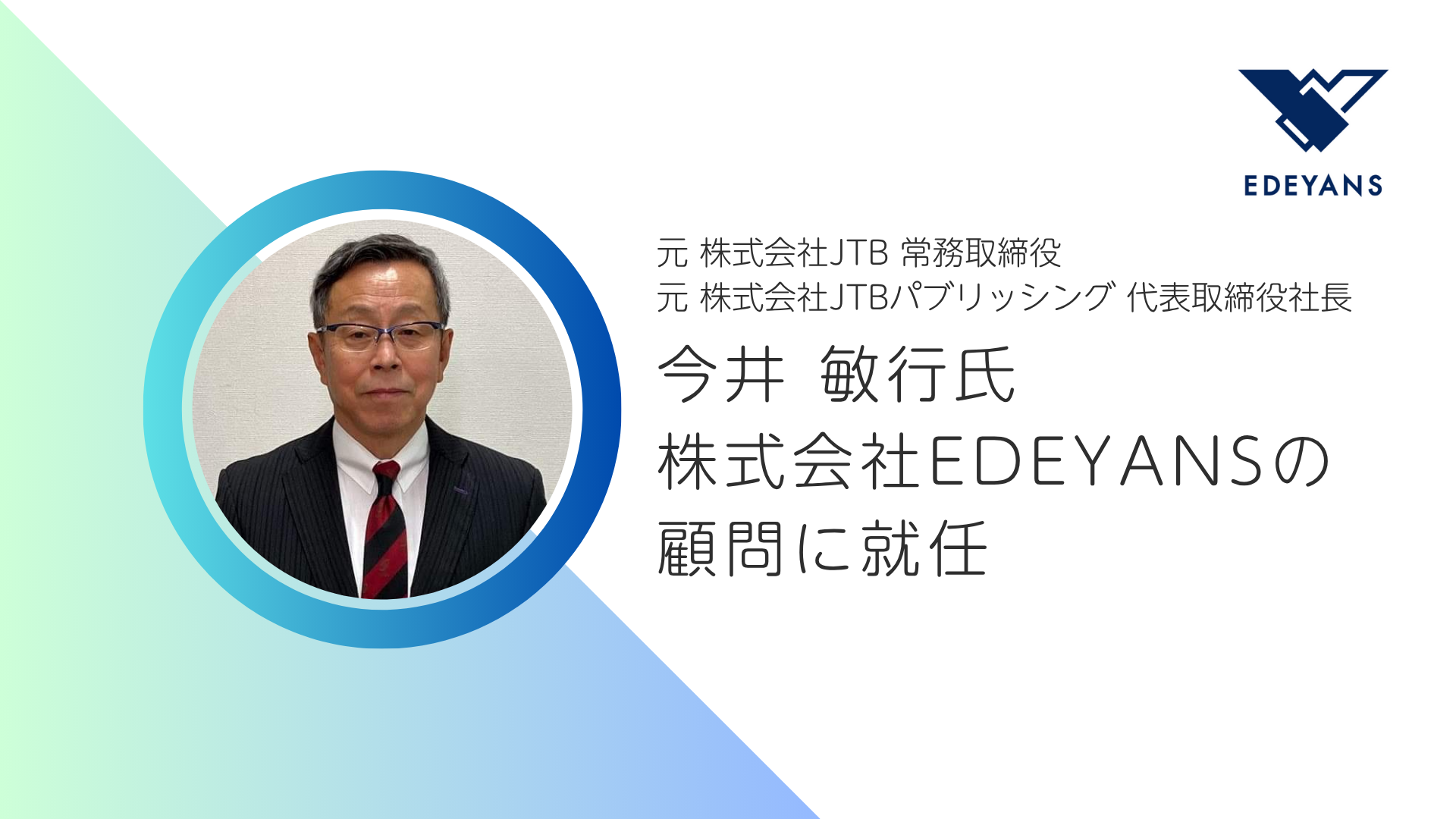 株式会社Edeyans(東京本社:東京都中央区、大阪本社:大阪市中央区、代表取締役社長:片山 裕之、以下「Edeyans」)は、元 株式会社JTB 常務取締役の今井 敏行(いまい・としゆき)氏が当社顧問に就任したことをお知らせします。今井氏の豊富な経験と観光産業におけるネットワークを活かし、ホテル・旅館における客室清掃現場から紙と電話を一掃する『Jtas』の全国展開を一段と強化してまいります。