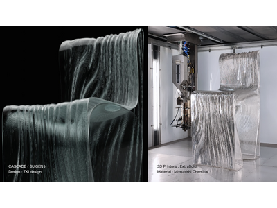 ExtraBoldは “Green Creative(TM)” を掲げ、再生素材やバイオマスプラスチックを活用した大型3Dプリント技術を開発しています。今回の作品「SUI GEN」では、光学的透明性と高耐久性を兼ね備えた三菱ケミカルの
