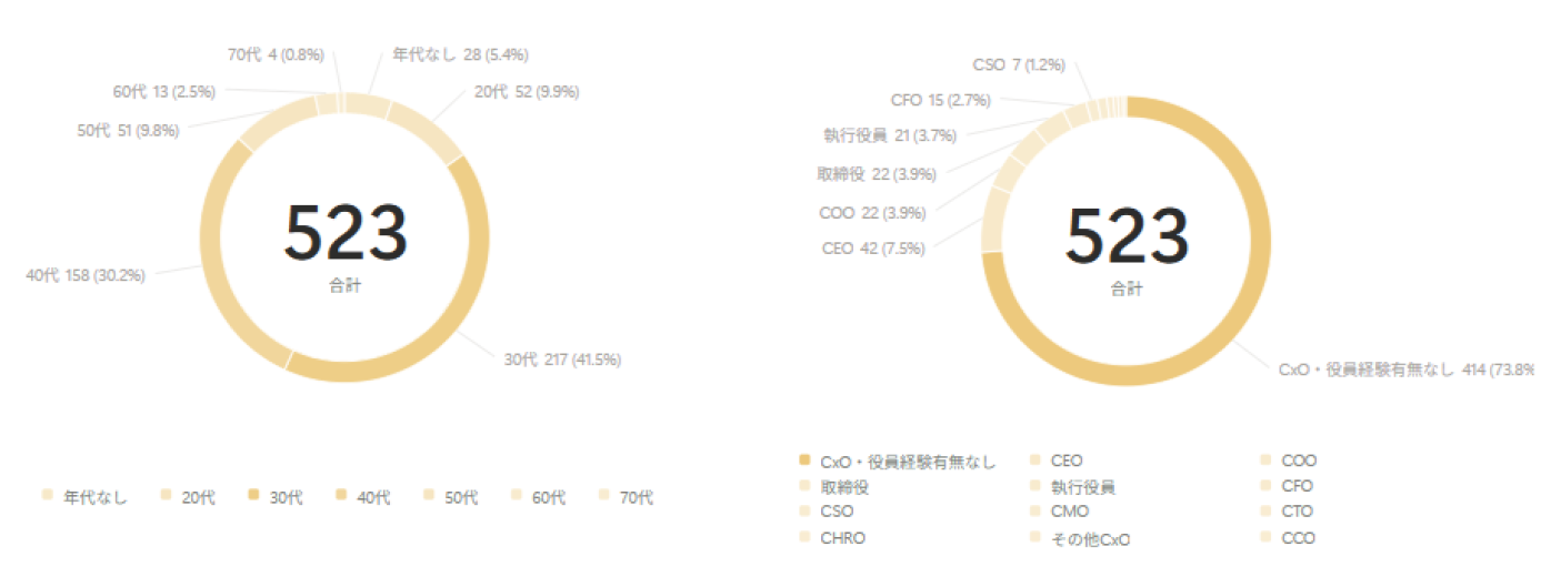 CxO-Passの登録者は30代・40代が中心で、全体の約70%を占めています。若手ながら経営視点を持ち、スタートアップの成長フェーズに柔軟かつ実行力をもって関われる人材が多く登録されています。登録者の約26%はCxOや役員経験を有しており、CEO経験者は42名、COO・取締役・執行役員など多様な経営経験者も含まれています。一方、未経験ながら、将来的にCxOとしての活躍を目指す意欲的な人材も多数登録しています。
