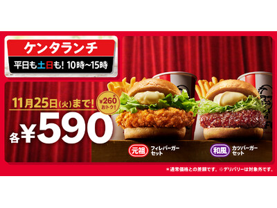 日本ケンタッキー・フライド・チキン株式会社(社長:遠藤 久、本社:神奈川県横浜市)は、全国のケンタッキーフライドチキン(以下:KFC)店舗で、10月29日(水)から11月25日(火)までの期間限定で、「ケンタランチ」の人気バーガーセット2種、「チキンフィレバーガーセット」と「和風チキンカツバーガーセット」を各590円で販売いたします。