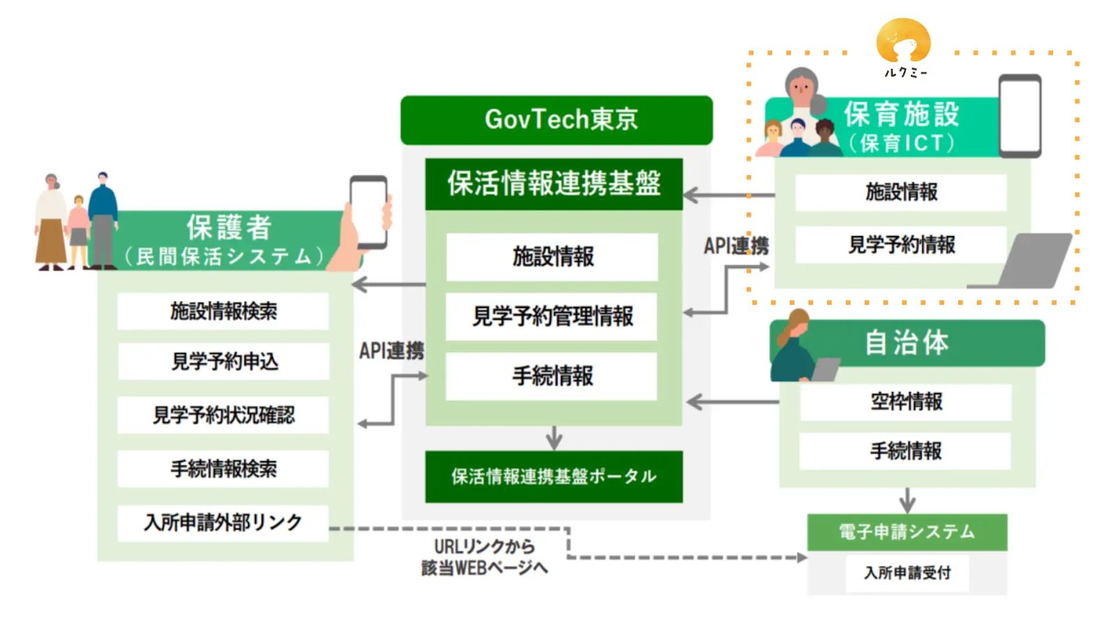 ユニファは、「保活ワンストッププロジェクト」に2024年10月より参画し、東京都が構築する「保活情報連携基盤」とルクミーを接続するためのシステム改修を行いました。これにより、保護者側だけではなく、保育施設側においても、保活中の保護者からの園見学予約状況をルクミー上で通知として受け取り、シームレスに確認することが可能となりました。日々の保育業務の効率化と保護者への情報提供の円滑化を実現し、保育施設のDX推進に貢献しています。