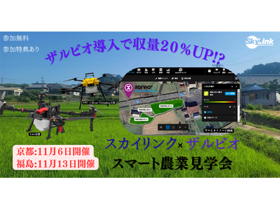 ドローンの販売や産業向けソリューションを展開する、SkyLink Japan(株式会社WorldLink & Company 本社:京都市北区、代表取締役:須田信也)は、農業用ドローンとザルビオとの連携を駆使した可変散布デモフライト会、スカイリンク×ザルビオ -スマート農業見学会-を京都11月6日(木)、福島11月13日(木)にて実施します。