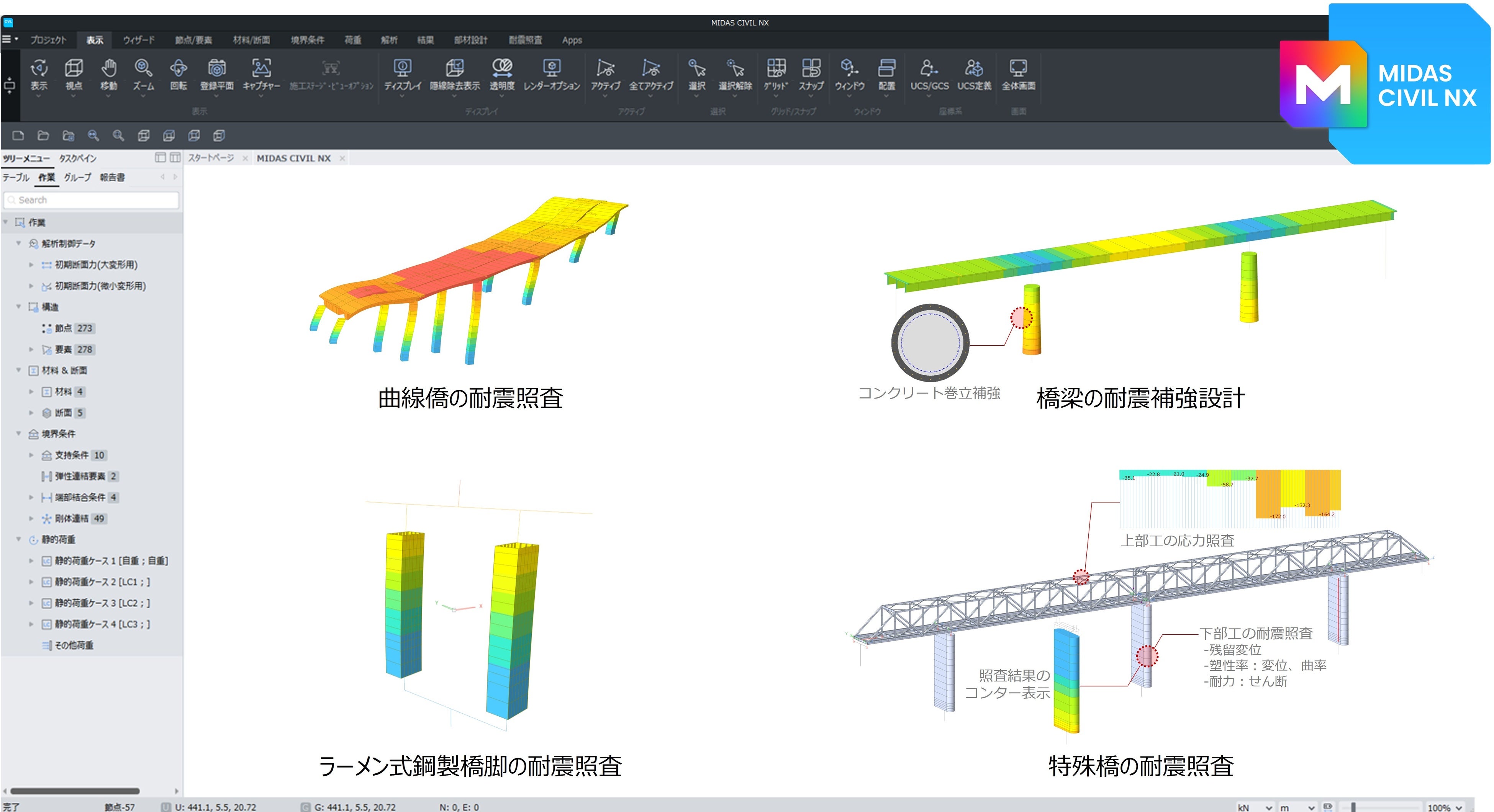 既設橋梁に対する耐震診断(動的解析を含む)から、補強工法の検討(免震支承や巻立補強)まで、土木構造分野の3次元構造解析・耐震設計プログラム MIDAS CIVIL NX を活用して、一連の耐震設計・補強検討フローを体験します。
