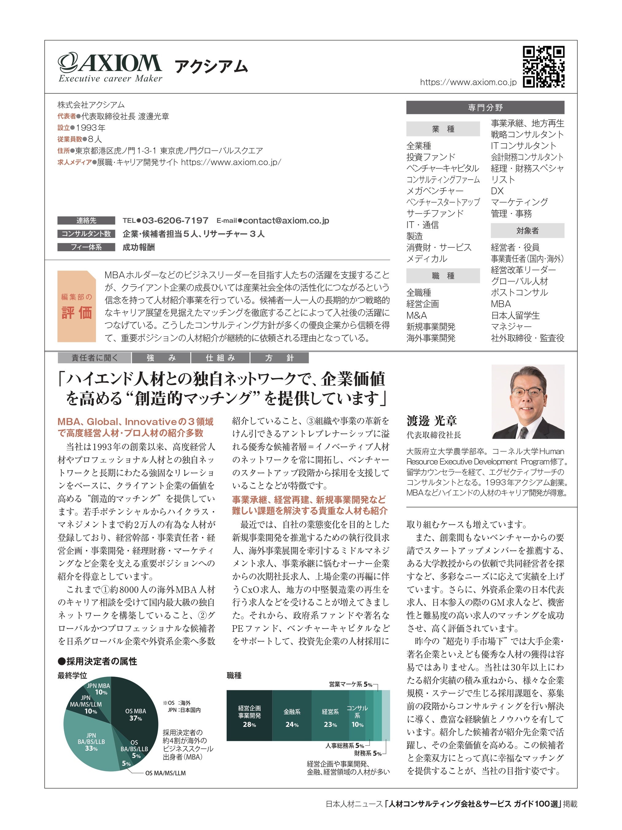 人事専門誌「日本人材ニュース」を発行する株式会社日本人材ニュース社(東京都千代田区、代表取締役:吉越利成)は、企業の人材採用を支援できる優れたコンサルティング会社とサービスを紹介する「人材コンサルティング会社&サービスガイド100選」に、アクシアム(東京都港区、渡邊光章代表取締役社長)が参画したことをお知らせいたします。