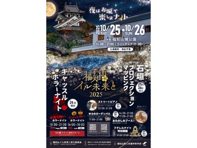 今年の福知山イル未来と2025は2日開催!今年の見どころは福知山城の麓を流れる法川付近の石垣へプロジェクションマッピングが初めて実施されます!また大人気お化け屋敷が今年は新作で鬼お化け屋敷を福知山YEGにより実施されます。福知山城全体を使ったキャッスルホラーナイトとハロウィンイベントで食や遊びブースとして縁日が盛りだくさん!ストリートピアノやライトアップで秋の夜長を光と音楽で楽しんでいただけます。詳しくはイル未来とインスタグラムをご覧ください。