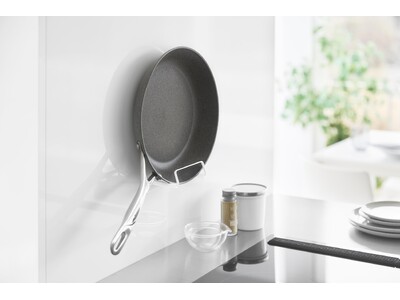 マグネットがつくキッチンパネルに浮かせて収納できるフライパンホルダーです。
