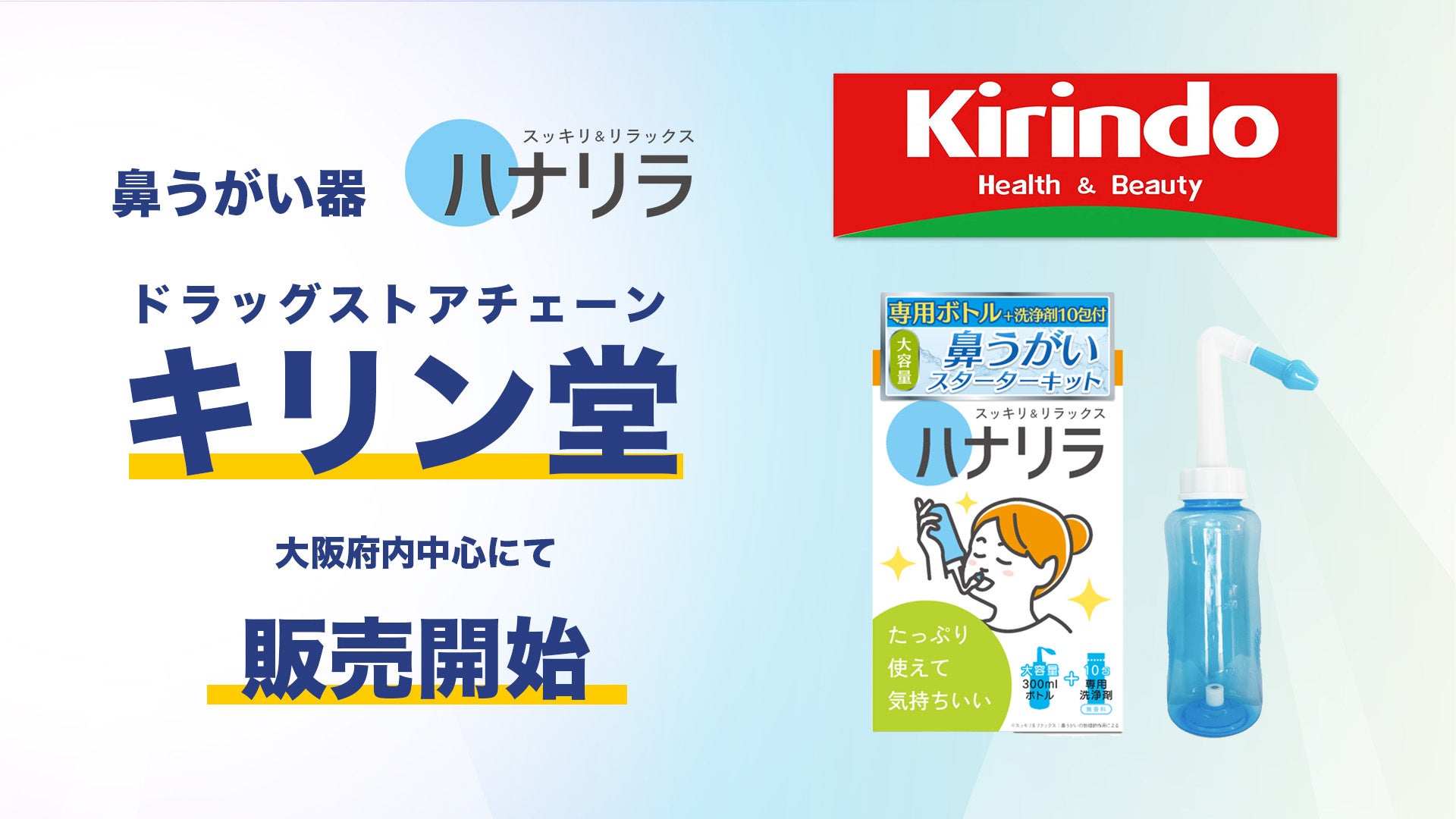 鼻詰まり・鼻の中の花粉・ほこり・ハウスダスト・雑菌などを物理的に洗い流す「鼻うがい」製品を製造・販売するパスクリエイト株式会社 (本社:東京都新宿区、代表取締役:飯原 崇暁、以下当社)が展開する鼻うがいブランド「ハナリラ」の製品がこの度、ドラッグストアチェーンキリン堂 (株式会社キリン堂、本社:大阪市淀川区宮原、代表取締役:寺西 豊彦)、大阪府内中心に関西地区で販売開始しました。