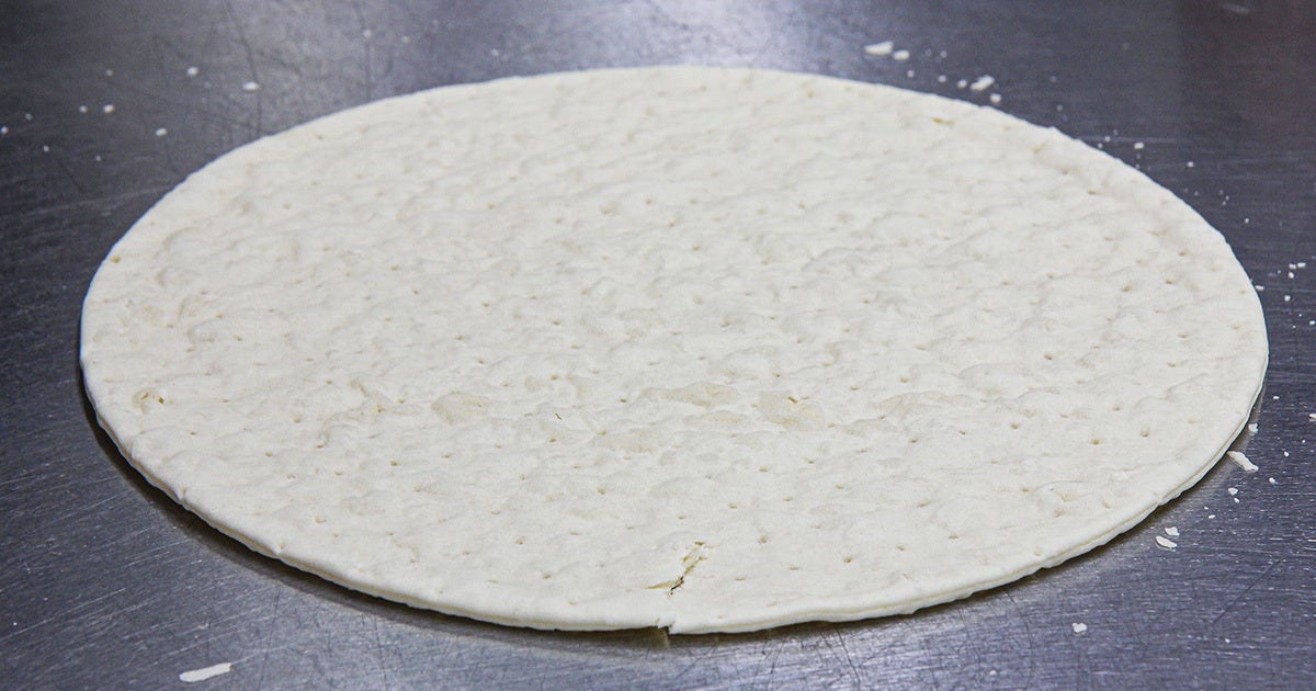 ▼規格外のピザ生地例:わずかな切れ目(※生地の手前端)ができてしまっている生地などを再利用