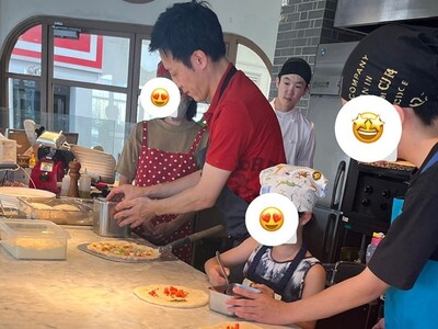 この夏、ラスカ平塚6階屋上庭園と一体となったオープンテラスが印象のイタリア料理店「アマルフィイホワイトガーデン」にて親子ピザ作り体験を実施