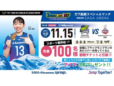 2025-26 大同生命SV.LEAGUE WOMEN 第6節 GAME1は「竹下製菓スペシャルマッチデー」としての開催が決定しました。開催に合わせて先着100名様限定、ブラックモンブラン・ミルクック・トラキチ君を食べて、「合計150点分」のあたりと観戦チケットが交換できるキャンペーンを実施いたします。