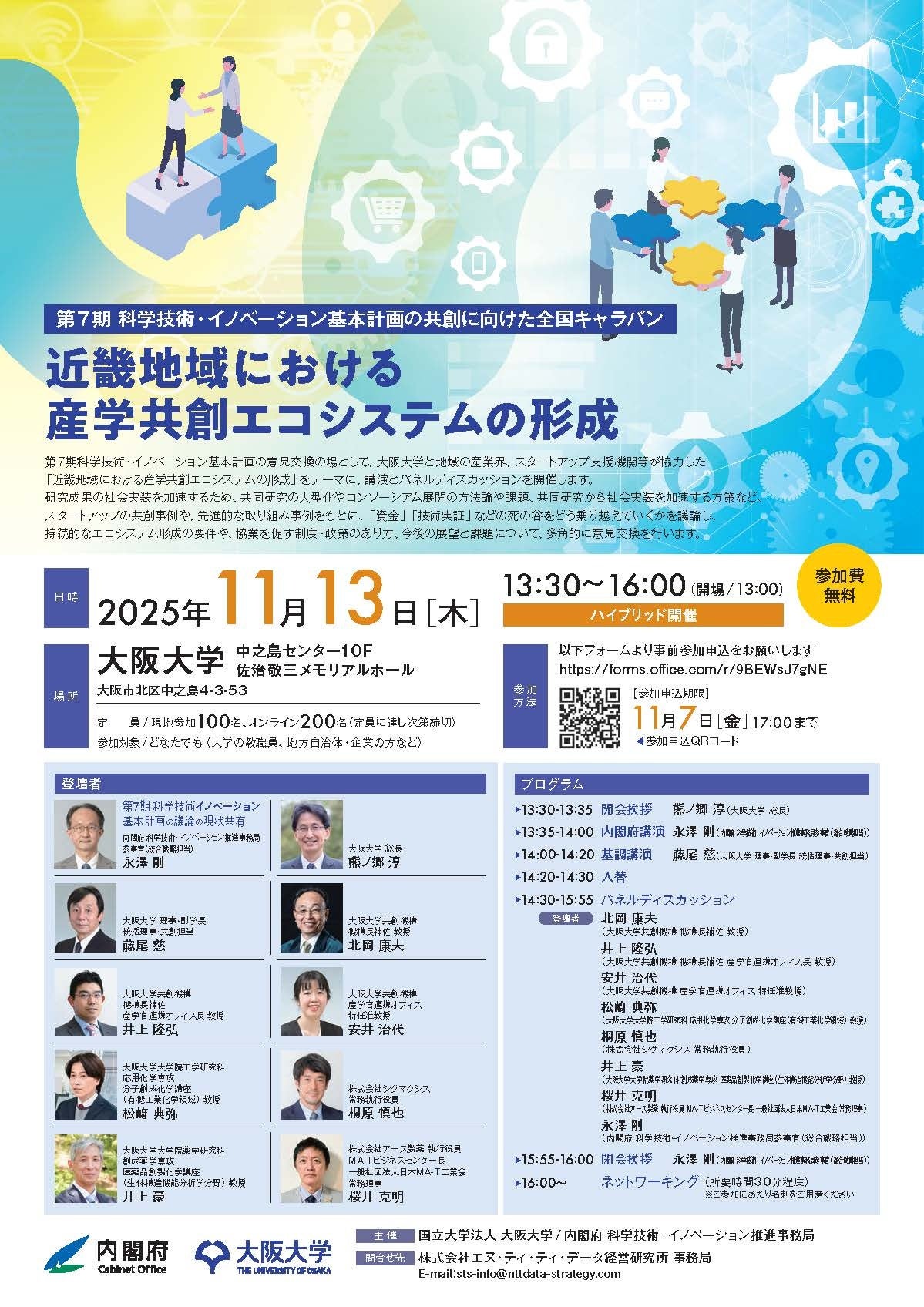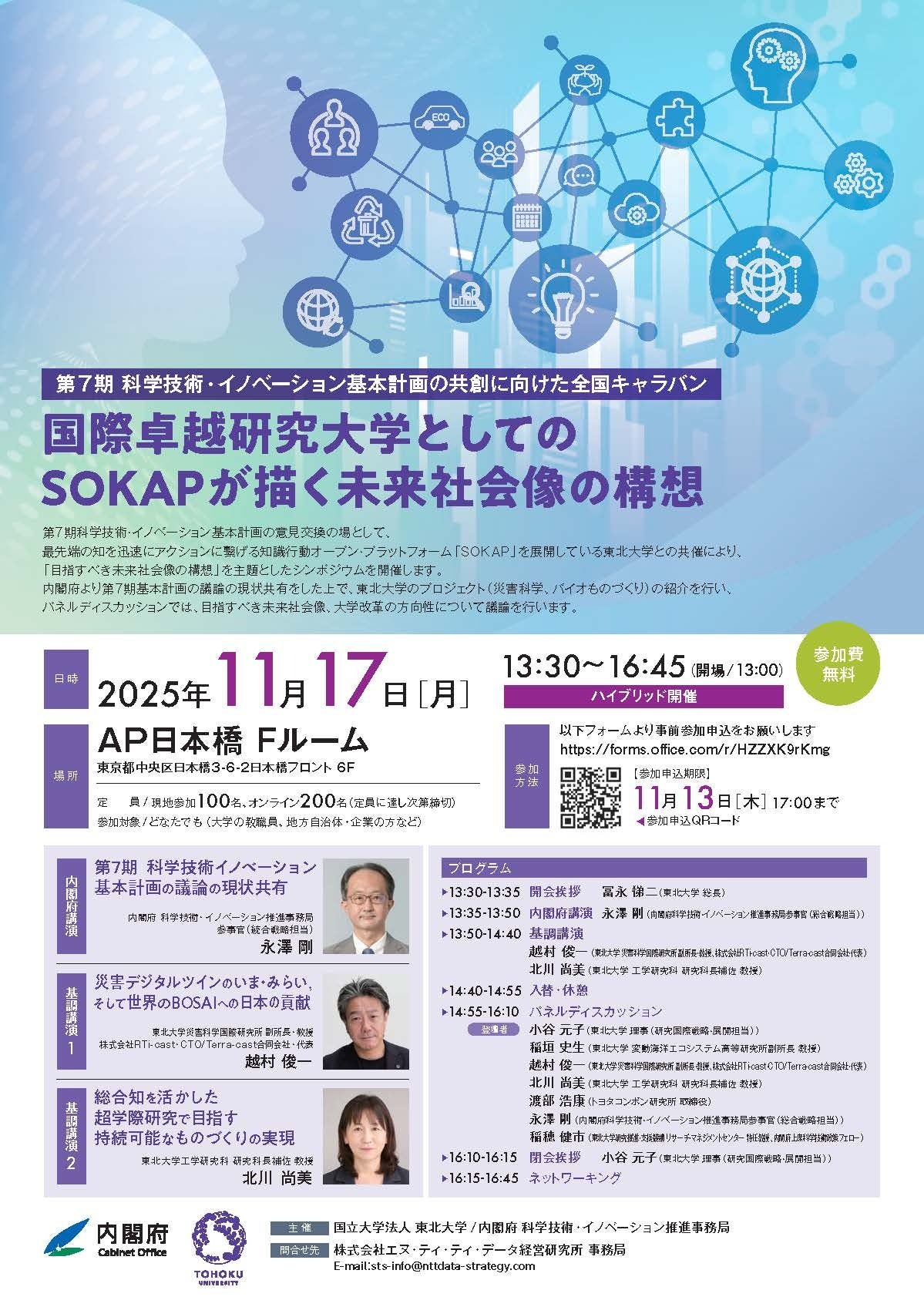 内閣府は、名古屋大学、大阪大学、東北大学の各大学と共催し、第7期科学技術・イノベーション基本計画の意見交換の場として、シンポジウムを開催します。各地域でのシンポジウムの開催概要は以下のとおりです。科学技術・イノベーションに関わる大学の教職員、地方自治体・企業の方など様々な方のご参加をお待ちしております。