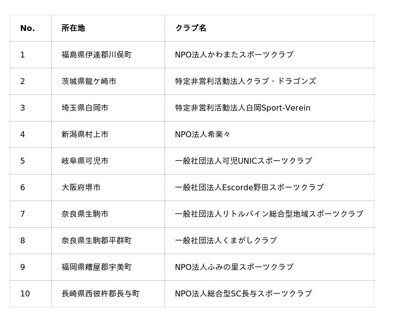 スポーツを「する」「みる」「ささえる」ための環境づくりを行うJSPO(正式名称:公益財団法人日本スポーツ協会 東京都新宿区/会長 遠藤利明)は、令和7(2025)年度から運用を開始した「総合型地域スポーツクラブ登録・認証制度」のうちの「認証制度」に基づき、19クラブからの申請のうち、10クラブを「部活動の地域展開タイプ」の令和7年度認証クラブとしました(認定日:令和7年10月8日)。